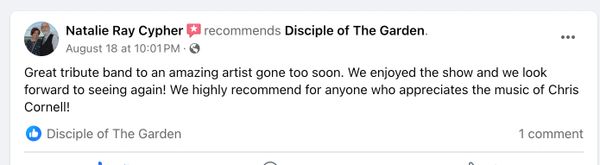 Disciple of the Garden - The Legacy of Chris Cornell is a heartfelt tribute dedicated to celebrating the legacy of the legendary Chris Cornell. D.O.G. channels the raw power and emotional depth of Cornell's iconic music, covering hits from Soundgarden, Audioslave, and his solo career. Each performance aims to honor his unparalleled voice, poignant lyrics, and groundbreaking contributions to rock music. The tribute band, Disciple of the Garden (D.O.G.) pays homage to the talents and legacy of Chris Cornell and his bandmates in Soundgarden, Temple of the Dog, and Audioslave. Based out of Westchester County, New York, and led by Joe Leo, guitarist and lead vocalist, D.O.G. is ready to deliver your favorite 90’s grunge, hard rock hits, and select deep cuts, as made famous by the Legend himself., Chris Cornell. Joe Leo emulates Chris Cornell, and is the closest embodiment both visually, and vocally. If you are looking to experience the catalogue of Soundgarden, Audioslave, Temple of The Dog, and Chris Cornell, Disciples of the Garden is the answer. With meticulous attention to detail, the band recreates the raw energy and emotive essence that made Cornell's music so influential. Disciple of the Garden (D.O.G.) faithfully allows fans to relive the magic of Cornell's extraordinary talent, his captivating stage presence, and the sheer intensity of his performances. As passionate fans and musicians, we strive to bring the same intensity and authenticity to the stage, keeping Chris Cornell's spirit alive through every note and lyric. Join us as we pay homage to the man whose music continues to inspire and move millions around the world. Performing all of the hits and a selection of deep tracks from albums such as Badmotorfinger, Superunknown, Down on The Upside, King Animal, Audioslave, Out of Exile, Revelations, and Temple of The Dog, Disciple of The Garden offers concert goers a moment of audio bliss taking them on a journey through the eclectic sounds of Soundgarden, Audioslave, Temple of The Dog, and Chris Cornell solo works as well. audio slave sound garden